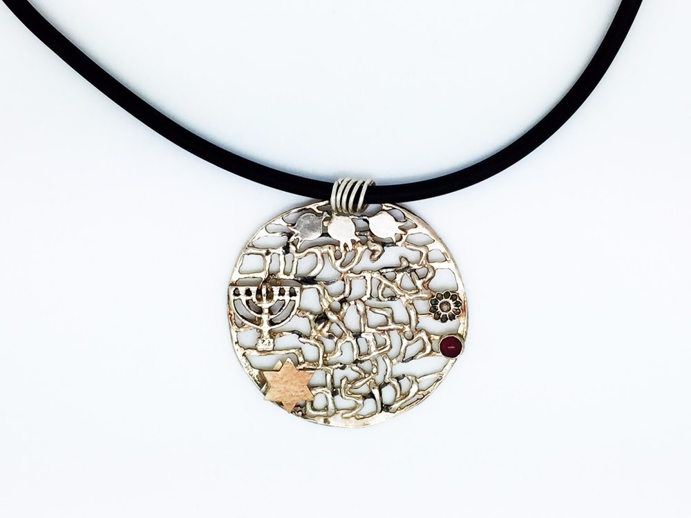 שרשרת סילקון, אורך: 41 ס"מ, עיטורים: רימונים, מנורה, מגן דוד - זהב 9K ואבן גרנט.